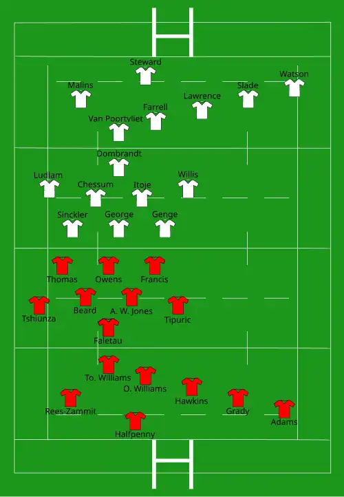 | Try: Malins (2) 24' m, 38' m Genge 48' c Con: Farrell (1/3) 49' Pen: Farrell (2/2) 43', 65' | Report | Try: Jones 15' c Van der Merwe (2) 29' m, 74' c White 51' c Con: Russell (3/4) 16', 53', 76' Pen: Russell (1/1) 69' |
