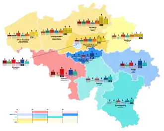 The 150 members of the Chamber of Representatives are elected in 11 multi-member constituencies, being the ten provinces and Brussels, with between 4 and 24 seats.[4] Seats are allocated using the D'Hondt method, with an electoral threshold of 5% per constituency.[5]