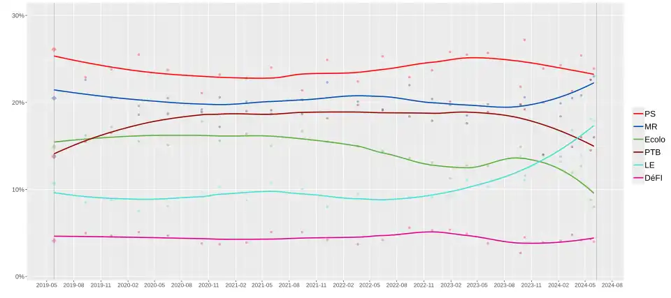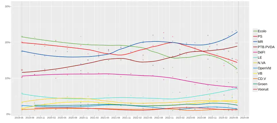 - ^ "Découvrez les résultats de notre sondage : le Vlaams Belang toujours plus haut, le MR en grande forme à Bruxelles" (in French). 25 April 2024. Archived from the original on 26 May 2024. Retrieved 15 June 2024.