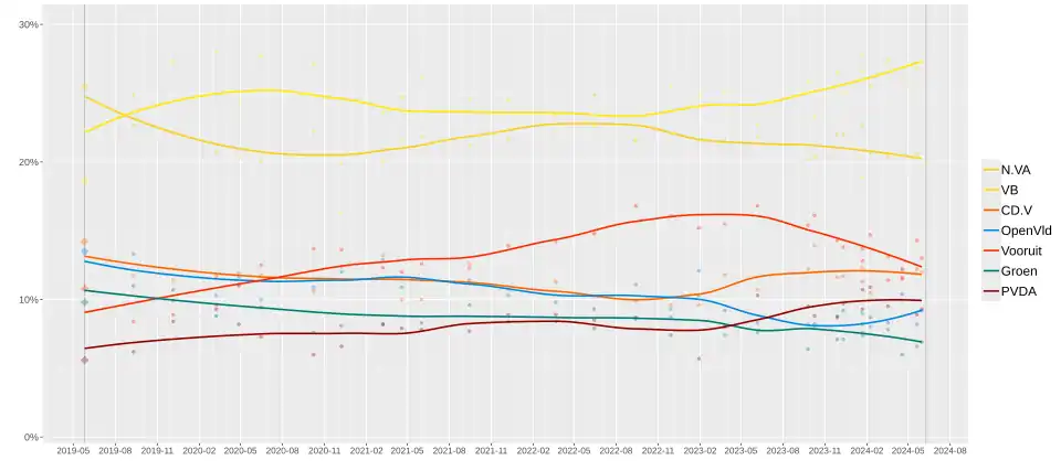 - ^ "DE GROTE PEILING. Vlaams Belang blijft grootste partij van Vlaanderen, Vooruit profiteert van Conner-effect" (in Dutch). 24 May 2024.