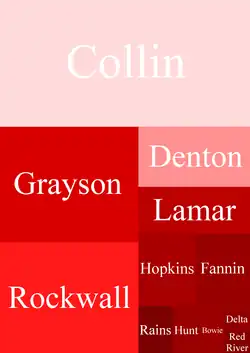 By county County[ 35] Pat Fallon Republican Simon Cardell Democratic Margin Total votes cast # % # % # % Bowie 3,724 84.48% 684 15.52% 3,040 68.97% 4,408 Collin 68,280 53.52% 59,291 46.48% 8,989 7.05% 127,571 Delta 2,217 85.73% 369 14.27% 1,848 71.46% 2,586 Denton 16,350 60.84% 10,523 39.16% 5,827 21.68% 26,873 Fannin 13,656 84.88% 2,432 15.12% 11,224 69.77% 16,088 Grayson 50,737 79.22% 13,309 20.78% 37,428 58.44% 64,046 Hopkins 13,685 83.40% 2,723 16.60% 10,962 66.81% 16,408 Hunt 4,458 85.09% 781 14.91% 3,677 70.19% 5,239 Lamar 16,850 81.77% 3,757 18.23% 13,093 63.54% 20,607 Rains 5,644 87.64% 796 12.36% 4,848 75.28% 6,440 Red River 1,455 87.07% 216 12.93% 1,239 74.15% 1,671 Rockwall 44,547 72.60% 16,815 27.40% 27,732 45.19% 61,362 Totals 241,603 68.38% 111,696 31.62% 129,907 36.77% 353,299