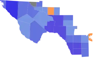 County results Casar: 50–60% 60–70% 70–80% 80–90% >90%Wright: 50–60% 60–70% 70–80% >90%Tie: 50% No data