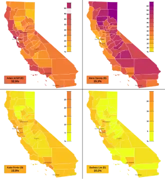 Lee, Porter, and Schiff have similar voting records in Congress and similarly progressive platforms. As a result, they were expected to differentiate themselves by their life stories and individual strengths rather than their ideologies.[59] All three have faced controversies that could damage their campaigns: Porter has been accused of mistreating congressional staff, Lee's age was seen as a potential issue, and Schiff was expected to face opposition from progressives due to his past support for overseas military intervention and for taking donations from groups affiliated with the oil, payday loan, and pharmaceutical industries, though he took a no corporate PAC pledge in his Senate campaign.[60][59] Schiff has also been criticized for listing his primary residence as Montgomery County, Maryland, in tax documents, though his campaign maintains that he lives in Burbank, California.[61] Other important factors include geography, as Schiff and Porter both represent southern California while Lee represents northern California, and diversity; a victory by Schiff would leave California with no female senators for the first time since 1992, while a victory by Lee would make her only the fourth black woman to serve in the Senate.[59][62]