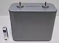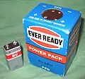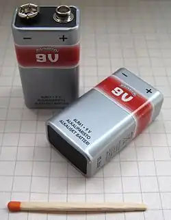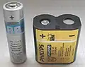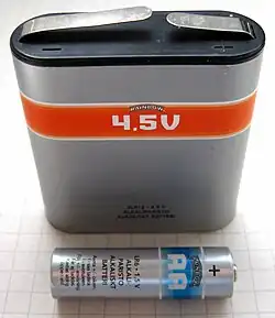 ![]() | 4.5-volt | 1289 (in the UK) Pocketable battery 4.5 V MN1203 Type 3336 (Soviet Union/Russia) | 3LR12 (alkaline) 3R12 (carbon‑zinc) | 3LR12 (alkaline) 3R12 (carbon‑zinc) | 6135-14-376-5079 6135-01-125-4867 6135-13-119-1782 6135-15-212-3288 6135-14-226-6412 6135-14-552-6802 6135-15-167-7801 6135-12-120-1247 6135-26-050-3958 6135-33-155-0999 | 6,100 (alkaline) 1,200 (carbon‑zinc) | Alkaline carbon‑zinc (3 cells): 4.5 | Two 6–7 mm wide metal strips +: shorter strip −: longer strip | H: 67 L: 62 W: 22 | This battery, introduced in 1901, was very common in continental Europe until the 1970s. It usually contains three B cells in series. In Switzerland as of 2008, 4.5-volt batteries account for only 1% of primary battery sales.[91] |