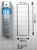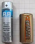 ![]() | A | R23 (carbon‑zinc) LR23 (alkaline) #4 (China) | 1.5 | 17 × 50 | More common as a NiCd or NiMH cell size than a primary size, popular in older laptop batteries and hobby battery packs. Various fractional sizes are also available; e.g., 2⁄3 A and 4⁄5 A. | ||||
