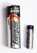 ![]() | AA | U12 or HP7 (In the UK) Pencil-sized Penlight Mignon MN1500 MX1500 MV1500 Type 316 (Soviet Union/Russia) UM 3 単3 (JIS)(carbon-zinc) AM-3 (JIS)(alkaline) #5 (China) | LR6 (alkaline) R6 (carbon–zinc) FR6 (LiFeS2) HR6 (NiMH) KR6 (NiCd) ZR6 (NiOOH) | 15A (alkaline) 15D (carbon–zinc) 15LF (LiFeS2) 1.2H2 (NiMH) 1.2K2 (NiCd) | 6135-15-051-9613 6135-66-037-7956 6135-19-003-8038 6135-14-304-9752 6135-01-601-5818 6135-99-195-6708 6135-21-844-0864 6135-00-985-7845 6135-99-052-0009 | 2,700 (alkaline) 1,100 (carbon–zinc) 3,000 (LiFeS2) 1,700–2,800 (NiMH) 600–1,000 (NiCd) 1,500 (NiZn) | 1.5 1.2 (NiMH, NiCd) | 14.5 × 50.5 (0.57 × 1.99) | Introduced 1907, but added to ANSI standard sizes in 1947. Used in many household electronic devices. |
