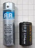 ![]() | CR123A | Camera battery 2⁄3A 123 CR123 17345 16340 CR-123A 6135-99-851-1379 (NSN) | CR17345 (lithium) | 5018LC (lithium) | 1,500 (lithium) 700 (Li–ion rechargeable) | 3 (lithium) 3.6 (Li-ion) | Cylinder | +: Nub cylinder end −: Flat opposite end | H: 34.5 mm Ø: 17 mm[136] | A lithium primary battery, not interchangeable with zinc types. A rechargeable lithium-ion version is available in the same size and is interchangeable in some uses. According to consumer packaging, replaces (BR)2⁄3A. In Switzerland as of 2008, these batteries accounted for 16% of lithium camera battery sales.[77] |