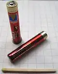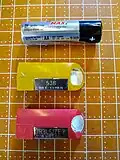 ![]() | AAAA | MX2500 Mini UM 6 (JIS) 単6 #9 (China) | LR8D425 (alkaline) | 25A (alkaline) | 625 (alkaline) 400-600 (NiMH) | 1.5 1.2 (NiMH) | 8.3 × 42.5 | Sometimes used in pen flashlights, laser pointers, powered styluses, calculators, fishing lures. | |