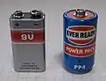 ![]() | PP3, 9-volt, or E[92] | Radio battery Smoke alarm battery Square battery Transistor battery 006P MN1604 Type Krona (Soviet Union/Russia) | 6LR61 (alkaline) 6LP3146 (alkaline)[93] 6F22 (carbon‑zinc) 6KR61 (NiCd) 6HR61 (NiMH) | 1604A (alkaline) 1604D (carbon‑zinc) 1604LC (lithium) 7.2H5 (NiMH) 11604 (NiCd) 1604M (mercury, obsolete)[94] | 6135-01-369-9792 6135-99-634-8080 6135-19-003-7917 6135-12-186-9177 6135-99-813-3838 6135-14-363-5842 6135-00-900-2139 6135-21-898-8449 6135-13-118-4403 6135-15-126-1831 6135-12-380-6813 6135-14-246-5048 6135-14-368-9793 6135-12-148-7026 6135-15-209-2996 6135-01-447-0949 | 565 (alkaline) 400 (carbon‑zinc) 1,200 (lithium) 175–300 (NiMH) 120 (NiCd) 500 (lithium polymer rechargeable) 580 (mercury, obsolete) | Alkaline carbon‑zinc (6 cells): 9 Lithium (3 cells): 9 NiMH / NiCd (6, 7 or 8 cells): 7.2, 8.4 or 9.6[111] | Both on same end +: male clasp −: female clasp | H: 48.5 L: 26.5 W: 17.5 | Added to ANSI standard in 1959. Often contains six LR61 cells, which are similar to AAAA cells. |