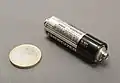 ![]() | N | Lady MN9100 UM 5 (JIS) 単5 E90 | LR1 (alkaline) R1 (carbon‑zinc) HR1 (NiMH) KR1 (NiCd) | 910A (alkaline) 910D (carbon‑zinc) | 6135-99-661-4958 6135-15-052-5342 6135-12-349-1146 6135-01-031-0862 6135-14-439-9946 6135-66-089-8336 | 800–1,000 (alkaline) 400 (carbon‑zinc) 350–500 (NiMH) | 1.5 | 12 × 30.2 | Rechargeable nickel–cadmium and nickel–metal hydride are far less common than other rechargeable sizes.[65] Mercury batteries of the same dimensions are no longer manufactured. |