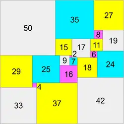 - ^ This square of side length 7 is adjacent to both the "central square" with side length of 9, and the smallest square of side length 2.