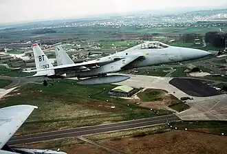 The squadron was upgraded to the McDonnell Douglas F-15A Eagle in April 1976. In 1980 more advanced F-15Cs and F-15Ds replaced the original F-15As. Throughout the 1970s and 1980s, the squadron conducted routine training missions and contributed aircraft and pilots to the 36th Tactical Fighter Wing's Zulu Alert facility during the Cold War. When the F-15s first arrived at Bitburg AB, a German "wild park" (zoo) came to the squadron and "adopted" it. The squadron designed an alternative emblem along with full-color aircrew patches with an eagle (animal) and US Flag on it and were dubbed the "Adlers" (which is German for eagle). For a time in the late seventies and early eighties the "Adler" name and emblem were used exclusively within the "ops" portion of the squadron, while the attached maintenance unit retained the "Stingers" name and emblem. In 1982, a new squadron commander made the unpopular decision that the "Adler" patch would no longer be used, and reinstate the Walt Disney "Bumblebee" patch, which was the official patch.[4]