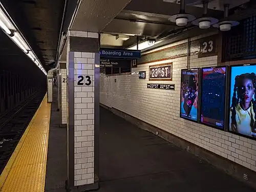 There are no open crossovers or crossunders between the platforms.[39] The platform extensions had beige tiles. During station renovations in 1988, the beige tiles were removed and the original, white ones restored. It has IND-style signs indicating the way to the exits at 22nd and 23rd Streets. An ornate fare control grille on the southbound side is a piece of artwork entitled Long Division by artist Valerie Jaudon, which was installed during the renovation.[40] The station features a back-lit "23 Street/Park Avenue South" sign at the platform level fare control. The station does not contain restrooms.