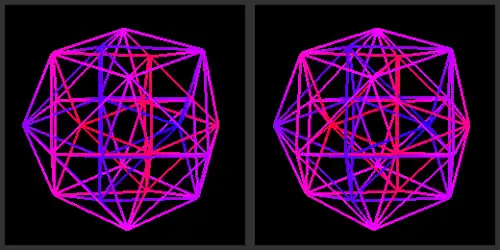 ^ abAs in the 16-cell, the isocline is an octagram which intersects only 8 vertices, even though the 24-cell has more vertices closer together than the 16-cell. The isocline curve misses the additional vertices in between. As in the 16-cell, the first vertex it intersects is √2 away. The 24-cell employs more octagram isoclines (3 in parallel in each rotation) than the 16-cell does (1 in each rotation). The 3 helical isoclines are Clifford parallel;[ad] they spiral around each other in a triple helix, with the disjoint helices' corresponding vertex pairs joined by √1 = 60° chords. The triple helix of 3 isoclines contains 24 disjoint √2 edges (6 disjoint great squares) and 24 vertices, and constitutes a discrete fibration of the 24-cell, just as the 4-cell ring does.