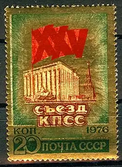 The 25th Congress of the Communist Party of the Soviet Union met in Moscow from February 24 to March 5, 1976. General Secretary Leonid Brezhnev greeted 4,998 Soviet delegates and representatives from 96 foreign countries. Among Communist-ruled nations, only the People's Republic of China and Albania did not send representatives.[1] The congress itself produced few surprises, with the main emphasis placed on the stability of the political and economic situation and the prospects of continued success in the future. Brezhnev declared that the USSR would not invade or fight other countries, but also stated that he would support national liberation movements, despite détente. Little mention was made of fundamental problems facing the Soviet Union— the slowdown of the rate of economic growth, the low output of agriculture despite heavy investment. The only critical voices raised were those of foreign Communists. French Communist leader Georges Marchais boycotted the congress after criticizing the Soviet Union's suppression of dissidents.