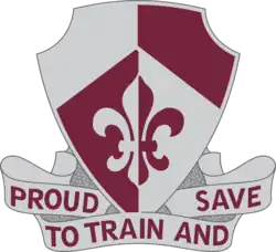 Description/Blazon: A Silver color metal and enamel device 1+1⁄8 inches (2.9 cm) in width overall consisting of a shield blazoned: Per pale and per chevron Argent and Sanguine, a fleur-de-lis counterchanged. Attached below the shield, a tripartite Silver scroll inscribed "PROUD TO TRAIN AND SAVE" in Maroon letters.[10]