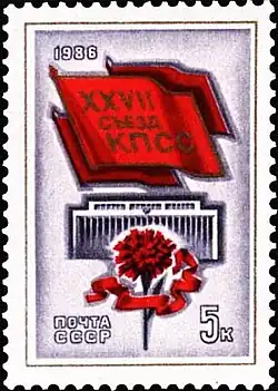 The 27th Congress of the Communist Party of the Soviet Union was held from 25 February to 6 March 1986 in Moscow.[1] This was the first congress presided over by Mikhail Gorbachev as General Secretary of the Central Committee of the CPSU.[2] In accordance with the pattern set 20 years earlier by Leonid Brezhnev, the congress occurred five years after the previous CPSU Congress.[2] Much had changed in those five years.[2] Key figures of Soviet politics, Mikhail Suslov, Leonid Brezhnev, Yuri Andropov, Dmitriy Ustinov, and Konstantin Chernenko had died, and Mikhail Gorbachev had become General Secretary of the Party.[2] For this reason the congress was widely anticipated, both at home and abroad, as an indicator of Gorbachev's new policies and directions.[2] The congress was attended by 4993 delegates. It elected the Central Committee of the 27th term.[2]