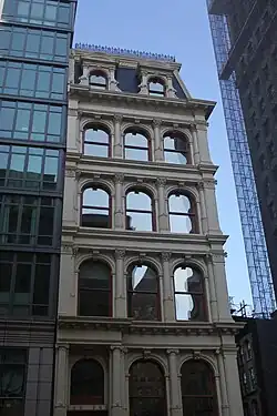 The preservationist Margot Gayle, president of the group Friends of Cast-iron Architecture, had advocated for the New York City Landmarks Preservation Commission (LPC) to designate the building as a city landmark since 1974.[39] The LPC began considering designating 287 Broadway, 319 Broadway, and 90–94 Maiden Lane as landmarks in 1987.[39][40] LPC officials believed that the building was a "good example" of Italianate palazzo architecture in New York City, especially because the structure's original mansard roof was almost entirely intact.[39] At a public hearing for the proposed landmark designation, witnesses described 287 Broadway as one of New York City's few surviving examples of a cast-iron building designed in mixed Italianate and French Second Empire styles.[22] Supporters of the designation praised the design of its windows and columns.[40] The Gindi family, which still owned the building, opposed the designation.[41] The LPC designated 287 Broadway as a city landmark on August 29, 1989.[42]
