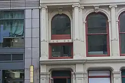 In the southernmost bay of the Broadway elevation, the building's main entrance was formerly at the second story; this has since been converted into an arched window with a horizontal transom bar.[13] A stoop, or outdoor stairway, ascended from the sidewalk to the second-floor entrance.[14] The former entrance bay is flanked by a pair of Ionic columns, which are fluted at their bases; these columns support a projecting entablature. The other openings on the second story contain archways with wooden sash windows, which are flanked by Ionic columns and topped by scrolled keystones.[6] These features gave the second floor the appearance of a piano nobile or main floor.[14]