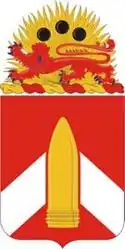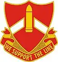 A Gold color metal and enamel device 1+1⁄8 inches (2.9 cm) in height overall consisting of a shield blazoned: Gules, a chevron Argent overall an artillery shell Or that portion on the chevron fimbriated of the field. Attached below the shield a Red scroll inscribed “WE SUPPORT THE LINE” in Gold letters.