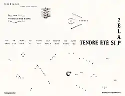 That the idea of simultanism is essentially naturalistic is obvious; that the polyphony of interwoven sounds and meaning has a decided effect upon our senses is unquestionable, and that we can get at the spirit of things through this system is demonstrable.- This text served as the magazine's manifesto, and it paid homage to the artist who was the primary influence in the design and presentation of the publication, Apollinaire.[7] As if to confirm this influence, Apollinaire's calligram "Voyage" was included in the center of a triptych which formed by opening the six hinged pages of the issue.