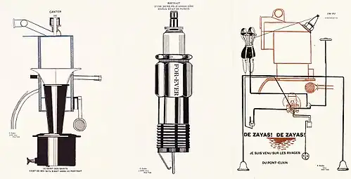 - Inside was the visual poem Femme (Elle) by de Zayas and Picabia's machine drawing Voilà Elle, starkly opposing and complementing each other at the same time. Literature professor Dickran Tashjian suggests that "the woman of the poem and the woman of the machine drawings are one and the same...The juxtaposition of the poem and the drawing...leads the viewer into a mechanistic universe where correspondences between the feminine ideal and the mindless machine are overwhelming. Just as the machine ironically undercuts the ideal, the entire mechanomorphic mythology derives its power from an inhuman eroticism. The circle is completed as one feeds upon the other."[3]