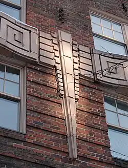 2 Horatio Street is rendered in red and brown brick. It has Art Deco references that include four horizontal, terra cotta decorations using greek key motifs at the fourth and sixteenth floors and circle-in-square motifs at the cornice. Overall, the building is not interestingly ornamented, the primary features being rusticated bricks at the corners and balconies under the 15th floor windows. In addition, the penthouse has a tower with terra cotta ornamentation.[14]