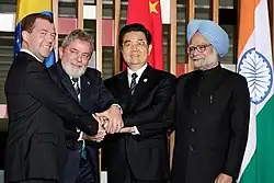 India took the initiative to call for improving the importance of the BRIC and IBSA groups.[6] Indian PM Singh also called for closer cooperation in the fields of energy and food security, as well as tapping into the potential of other sectors such as trade and investment, science and technology and infrastructure. He added that pooling together the experiences of each can lead to more inclusive growth. "We are four large countries with abundant resources, large populations and diverse societies... We aspire for rapid growth for ourselves and for an external environment that is conducive to our development goals. [Our people] expect us to work together so as to bring the benefits of inclusive social and economic development to them. Our grouping includes two of the largest energy producers and two of the largest consumers in the world. We can cooperate in both upstream and downstream areas, and in the development of new fuels and clean energy technologies."[7]