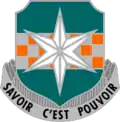 The unit's distinctive unit insignia (DUI) is a silver color metal and enamel device 1+1⁄8 inches (2.9 cm) in height overall consisting of a shield representing the unit's coat of arms with a silver scroll attached around the sides and bottom of the shield inscribed, "SAVOIR C'EST POUVOIR" (Knowledge is power, in French) with black-colored lettering.[30]