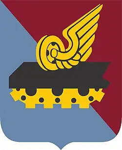 The colors brick red and golden yellow are used for the Transportation Corps. The light blue symbolizes the unit's assignment to provide mobility to the Infantry Division. The armored vehicle and winged wheel refer to the type of vehicle used and the mobility function. The motto is based on the Chief of Staff's description of the mission of the Transportation Corps and translates to “Mobility is Power.”