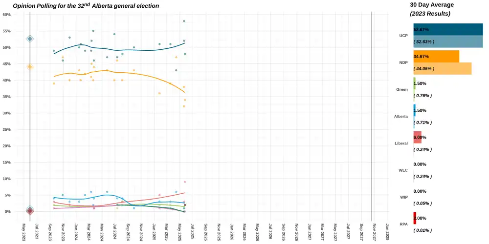 - ^ DeCillia, Brooks (May 28, 2025). "Poll suggests Alberta voters' honeymoon with Danielle Smith and UCP endures". CBC News. Retrieved May 28, 2025.