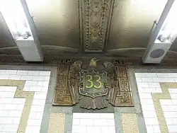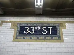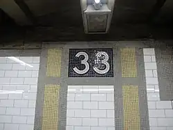 The fare control areas are at platform level, and there is no crossover or crossunder between the platforms.[4]: 4 The walls along the platforms near the fare control areas consist of a brick wainscoting on the lowest part of the wall, with bronze air vents along the wainscoting, and white glass tiles above. The platform walls are divided at 15-foot (4.6 m) intervals by buff and green mosaic tile pilasters, or vertical bands. In the original portion of the station, each pilaster is topped by green faience plaques depicting eagles, an allusion to the former 71st Regiment Armory at Park Avenue and 33rd Street; the eagles hold blue and white shields containing the number "33". A cornice with yellow and brown vine and fretwork patterns runs atop these walls.[4]: 4–5 [5]: 8 The platform extensions contain tiles with the number "33" atop the pilasters. Mosaic plaques with the words "33rd St." are also spaced at various intervals on the walls.[4]: 5 The mosaic tiles at all original IRT stations were manufactured by the American Encaustic Tile Company, which subcontracted the installations at each station.[45]: 31 The decorative work was performed by tile contractor John H. Parry and faience contractor Grueby Faience Company.[45]: 35 The ceilings of the northern fare control areas contain plaster molding.[4]: 4–5 [45]: 10