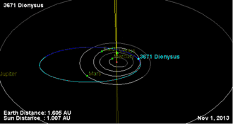 3671 Dionysus is a potentially hazardous asteroid (PHA) because its minimum orbit intersection distance (MOID) is less than 0.05 AU and its diameter is greater than 150 meters. The Earth-MOID is 0.01989 AU (2,976,000 km; 1,849,000 mi).[2] Its orbit is well-determined for the next several hundred years.