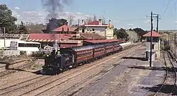 As a result of the NSW Department of Transport seeking expressions of interest to take over the weekends only passenger service on the Unanderra to Moss Vale line as a tourist operation, 3801 Limited commenced the Cockatoo Run heritage tourist train on 19 August 1995.[11][12] Initially the train operated from a base established in the Port Kembla Locomotive Depot Complex. Steam locomotive SMR18 was leased by 3801 Limited from the Hunter Valley Training Company for the service. To enable the locomotive to haul a train from Port Kembla to Moss Vale and return with one load of coal, the coal bunker was modified. Financial difficulties led to the suspension of the Cockatoo Run from November 1998 until March 1999, after which date the train ran between Port Kembla and Robertson only.[13][14] Furthermore, it was diesel hauled and ran for nine months of the year.[15]