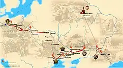 Along with the rest of the 8th Guards Army, from 1949 the division was stationed in Ohrdruf, Gotha and Meiningen, East Germany (the GDR).[1] The 39th Guards became a Motor Rifle Division in 1957.[2] At different times (up to the 1980s), some regiments and separate battalions changed their garrison and were placed in other cities of Thuringia - Arnstadt and Saalfeld. It was opposite the strategically vital Fulda Gap, and the U.S. V and VII US Corps in NATO's Central Army Group. The distance from the locations of parts of the division to the state border with Germany was about 5 kilometers. Withdrawal from Germany began on about 28 October 1991.