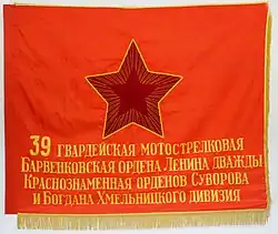 By a Resolution of the CPSU Central Committee, the Presidium of the Supreme Soviet of the USSR and the USSR Council of Ministers on 30 October 1967, the "For Service to protect the Soviet homeland and achieved high results in combat and political training and 50th Anniversary of the Great October Socialist Revolution to award the 39th Guards Motorized Rifle Barvenkovsky Order of Lenin Red Banner Orders of Suvorov twice and Bogdan Khmelnitsky Division the Commemorative Banner of the CPSU Central Committee, and leave it for an eternal possession as a symbol of valor.