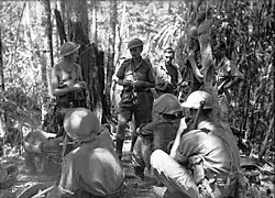 The battalion began training in earnest near Maitland, New South Wales, before being sent along with the rest of the 14th Brigade to the coast to undertake defensive duties near Newcastle.[8] In May they were relieved from these duties and returned to camp near Maitland, before going on leave prior to deployment overseas. By the end of the month the 3rd Battalion had arrived in Port Moresby where they began garrison duties as part of the 14th Brigade and alongside the 30th Brigade, which consisted of the 39th and 49th Battalions.[8] In July the New Guinea campaign began when the Japanese landed troops near Buna and began to move inland. In an effort to delay their advance in time for reinforcements to arrive from Australia, elements of 39th Battalion began a series of delaying actions around Kokoda, while the 3rd Battalion remained in Port Moresby to defend the seaport.[8] In early September, as reinforcements began to arrive, the battalion moved up the Kokoda Trail to Ioribaiwa, where they began patrolling operations under the command of the 21st Brigade in order to defend the village against advancing Japanese elements. Alongside the 2/6th Independent Company and the 2/14th and 2/16th Battalions, the 3rd Battalion helped hold the village for four days before falling back to Imita Ridge on 17 September.[8] Soon after the Japanese, having reached the limit of their supply lines, began to withdraw and the 3rd Battalion subsequently participated in the advance back up the Kokoda Trail, carrying out patrolling operations as they re-occupied numerous villages that had been lost earlier in the campaign.[3]