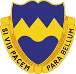 The regiment was constituted in the Organized Reserve on 24 June 1921 as the 414th Infantry, part of the Ninth Corps Area's 104th Division, which was later redesignated as the 104th Infantry Division. It was organized on 22 December 1921 with headquarters at Pocatello, Idaho.[1] 1st Battalion was headquartered at Lewiston, 2nd Battalion at Pocatello, and 3rd Battalion at Boise. On 28 January 1930, the entire regiment was relocated to Pocatello. The 414th conducted summer training in most years with the 38th Infantry at Fort Douglas. As an alternate form of summer training, it also trained civilians at infantry Citizens' Military Training Camps at Fort Douglas or Fort Missoula in some years. Its primary ROTC feeder school was the University of Idaho.[2]