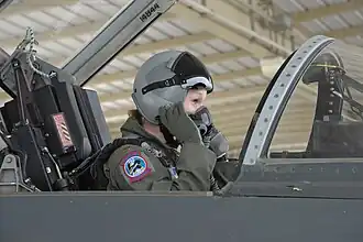 A 435th Fighter Training Squadron fighter candidate adjusts her mask and helmet before a training flight