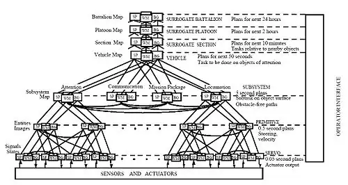 In the center of the figure, each map has a range and resolution that is appropriate for path planning at its level. At each level, there are symbolic data structures and segmented images with labeled regions that describe entities, events, and situations that are relevant to decisions that must be made at that level. On the left is a sensory processing hierarchy that extracts information from the sensory data stream that is needed to keep the world model knowledge database current and accurate.[5]
