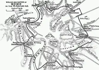 - Vitiges sets up seven camps, overlooking the main gates and access routes to the city, in order to starve it out. He blocks the Roman aqueducts that are supplying Rome with water, necessary both for drinking and for operating the corn mills.[2]
