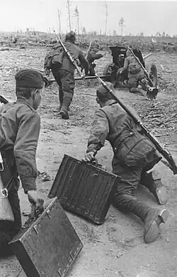In January 1940, the 54th became a regular infantry division.[4] The division had been stopped 15 kilometers southeast of Kuhmo in its advance, After Suomussalmi, the Finnish sent the 9th Infantry Division to encircle and destroy the 54th. On 29 January, the Finnish troops attack and cut off the 54th's rear units at Reuhkavaara. To prevent a repeat of Suomussalmi, 9th Army commander Vasily Chuikov sent reinforcements to relieve the division. The 54th was separated into several isolated pockets, but the threat from Soviet reinforcements forced the Finnish to divert troops. On 8 March, Finnish troops overran the pocket containing the 54th's headquarters. Half of the troops there were able to escape west. When the war ended on 13 March, the Finnish troops were within 40 meters of Soviet positions. During the Kuhmo battles, the 54th suffered casualties of slightly more than 2,000 killed.[5][6]