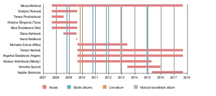 5Angels was formed in late 2007 by one of the girls' father, Michal Mertl.[2][3][4] The members were chosen from among students of the dance studio AT Studio Domino in Prague in a competition. The original lineup consisted of Kristýna Šlingrová, Nikol Šneiderová, Kristýna Pecková, Nikola Mertlová, and Tereza Procházková.[5][6] Procházková left the group in early 2008 and was replaced by Diana Kahleová. A more radical change in the group happened in 2009, when Kahleová was replaced by Hana Hladíková, and soon after that, Šlingrová, Šneiderová, Pecková, and Hladíková left.[7][8][9] Their departure was shrouded in a hostile atmosphere, and there were reports that the group had broken up. In September, the four had formed their own group, Diamond Cats.[10][11] 5Angels continued, however, with the sole original remaining member being Mertl's daughter, Nikola. Four new members were recruited: Angelina Šestáková, Michaela Exlová, Tereza Haklová, and Václava Vošmiková. Exlová was replaced by Veronika Spurná in June 2013, and Natálie Skotnická took Vošmiková's place in 2015.[12]