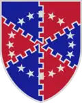 A Silver color metal and enamel device 1+1⁄32 inches (2.6 cm) in height overall consisting of a shield blazoned: Gyronny of six embattled Azure and Gules, a circle of sixteen mullets Argent.