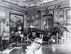 The first of the principal rooms upon entering the grand hall from the east was the 18-by-14-foot (5.5 m × 4.3 m) library, with 16th century French Renaissance panelling covering the walls. On the opposite side was the 33-by-18-foot (10.1 m × 5.5 m) parlor. It featured panelling in walnut, carved in the style of Grinling Gibbons. Next to the parlor was the Louis Quinze-style 33-by-38-foot (10 m × 12 m) salon, designed and built in Paris by Jules Allard. This room helped launch the taste in New York for French 18th century-style interiors. Its most important piece of furniture was an ebony secretary, now in the Metropolitan Museum of Art, that was built by Jean Henri Riesener for the use of Marie Antoinette at the Château de Saint-Cloud. The focal point of the salon was the ceiling, painted with a mythological scenes by Paul-Jacques-Aimé Baudry. He had recently completed ceiling paintings for the Palais Garnier.[8] Beyond the salon was the 20-by-27-foot (6.1 m × 8.2 m) breakfast room and an adjoining butler's pantry. At the western end of the grand hall one entered the banquet hall. At 50 by 35 feet (15 m × 11 m) and two stories high, it was the largest room in the house. It was Gothic in style, with seven foot high wainscoting, topped with Caen stone walls. One end of the room contained a massive double fireplace with marble caryatids supporting an oak over-mantel by Karl Bitter. A second floor gallery topped the fireplace ensemble. The opposite end of the room featured a musicians gallery. The banquet hall was illuminated by a large stained glass window by Eugène Oudinot.[4]