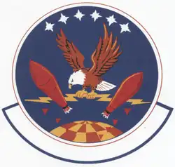 - ^ Approved 18 February 1952. Description: On a shield sky blue, between a cross red, edged white, in the two upper quarters, six bombs, points downward, three on either side of the cross, white, shaded blue, in the two lower quarters eight stars, four on each side of the cross, white, markings blue, in base over the cross a sphere white, markings blue, over the center of the cross a star white. thereover an eagle flying blue, markings white.
