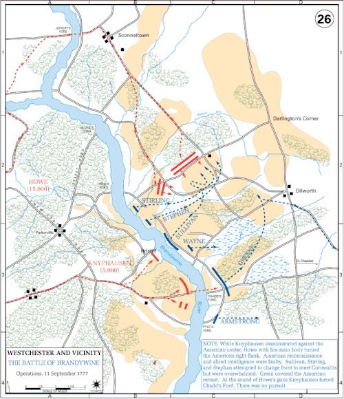 The Maryland 6th Regiment entered the theater of war for the first time at the Battle of Brandywine as part of the 2nd Maryland Brigade led by Brigadier General Chevalier Philippe Hubert Preudhomme de Borre.[5] This Brigade in conjunction with the 1st Maryland brigade, 3rd Virginia Brigade, 4th Virginia Brigade, New Jersey Brigade and the 3rd Pennsylvania Brigade formed a Division of 1,100 men led by Major General John Sullivan, known during the battle as Sullivan's Wing.