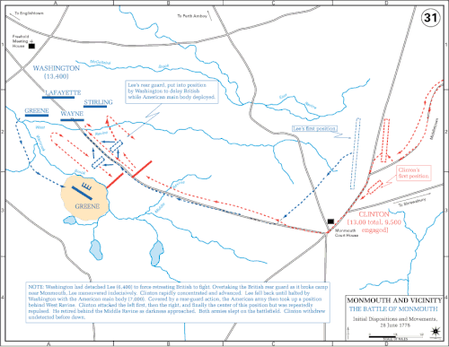 Fought on 28 June 1778, at Monmouth Court House, New Jersey, between George Washington's Continental army and Lieutenant General Henry Clinton's British forces, initiated by Washington, the primary objective was for the American forces to attack the rear of Clinton's army as the British left the courthouse for redeployment in New York.[8] The overall battle was inconclusive in terms of strategic advantage, but the American forces suffered twice as many casualties as their British opponents, due to a disorganized American attack followed by a swift British counterattack.