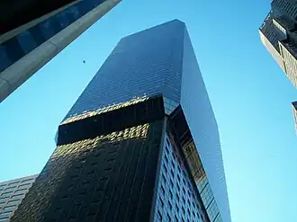 707 17th Street has a somewhat unusual "setfront" design, rather than the usual setback found in other Denver skyscrapers such as 1801 California Street.[8] The building bulges out and becomes wider at its 21st floor, and this widening is described as a "setfront".[8] The narrower region at the bottom of the building is home to the Hilton hotel, whereas the upper, wider floors contain most of the commercial space.[8] The building's façade is composed of black glass, and it is an example of international-style "black box" architecture.[1]