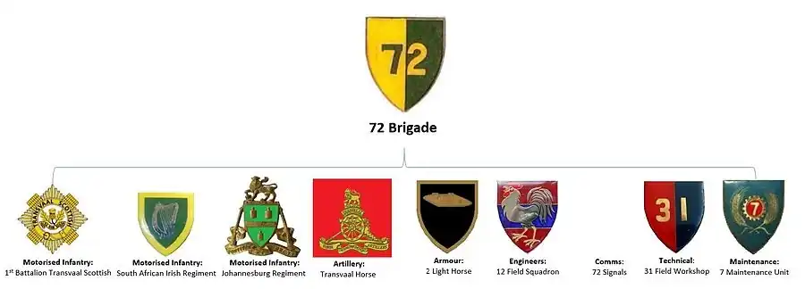 72 Motorised Brigade was established in Kensington, Johannesburg 72 Motorised Brigade appears to have been made up of the following units, soon after formation in 1972.[6] Infantry included 1st Battalion, Transvaal Scottish, the South African Irish Regiment, and the Johannesburg Regiment, artillery was provided by the Transvaal Horse Artillery, armour by the 1 Light Horse Regiment, engineer support by 12 Field Squadron SAEC, signals by 72 Signals Unit SACS, and service support by 31 Field Workshop and 7 Maintenance Unit.
